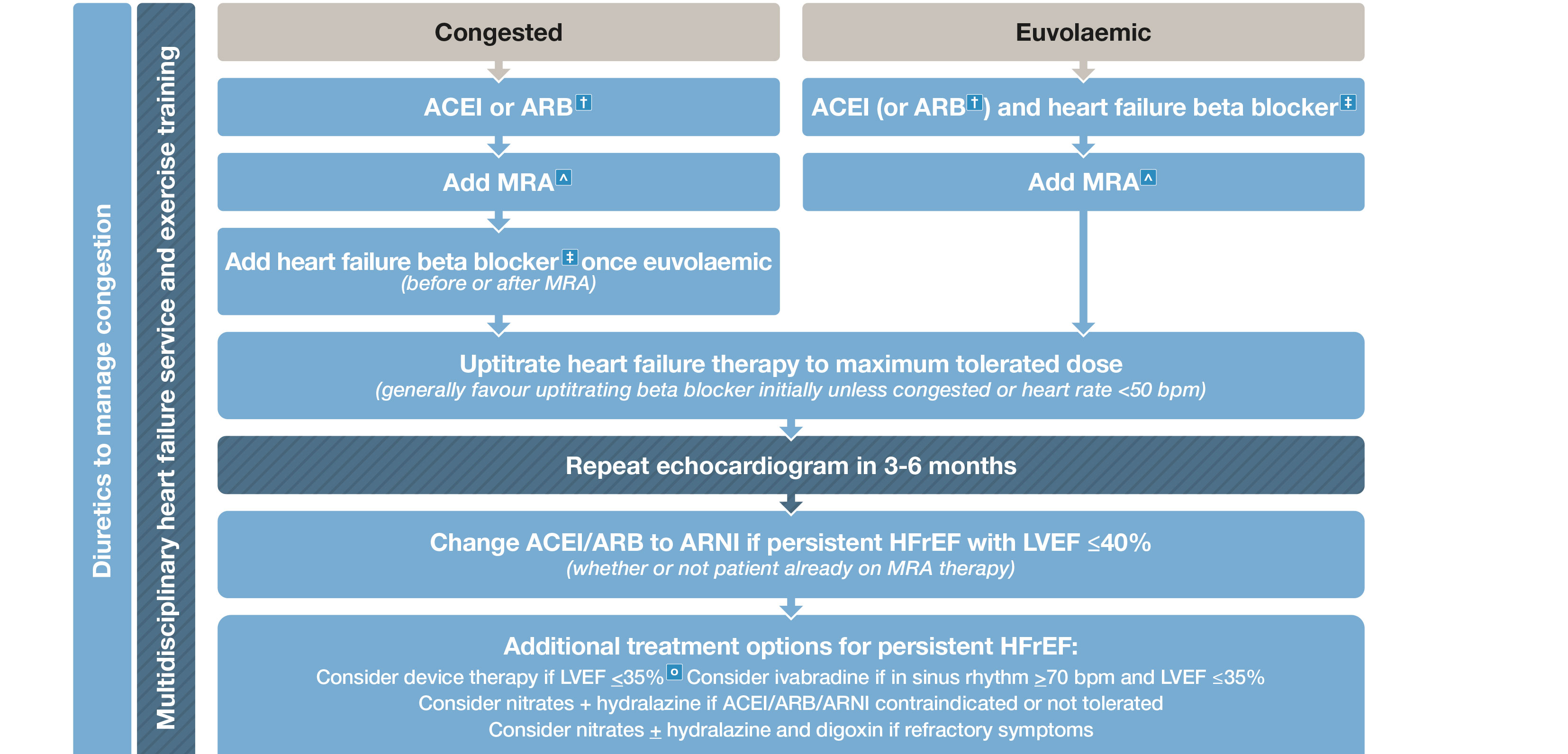 ACEI = angiotensin-converting enzyme inhibitor; ARB = angiotensin receptor blocker; ARNI = angiotensin receptor neprilysin inhibitor; CRT = cardiac resynchronisation therapy; ICD = implantable cardioverter defibrillator; LVEF = left ventricular ejection fraction; MRA = mineralocorticoid receptor antagonist. * HFrEF refers to patients with symptoms ± signs of heart failure associated with and LVEF < 50% (unless otherwise specified). † ARB should only be used if ACEI is contraindicated or not tolerated. ‡ Carvedilol, bisoprolol, metoprolol succinate, nebivolol. ˆ Commencing MRA usually avoided if serum K > 5 mmol/L or CrCl < 30 mL/m. ○ ICD and/or CRT. Adapted with permission from Tomlinson S, Atherton JJ. Heart failure – the crucial role of the GP. Medicine Today 2018; 19: 19-27.