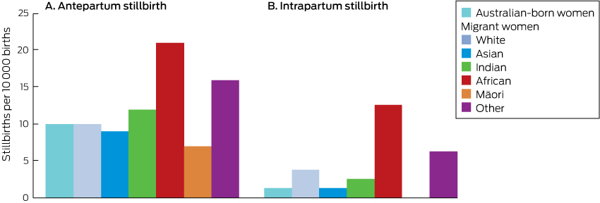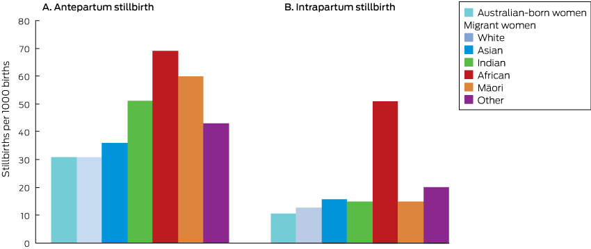 In this whole population study, the prevalence of stillbirth among migrant women in WA was lower than in their countries of origin,1 but the prevalence of antepartum stillbirth was higher among migrant women with Indian, African, or “other” origins than among Australian-born women, and the prevalence of intrapartum stillbirth was higher among migrant women with African or “other” origins than among Australian-born women.