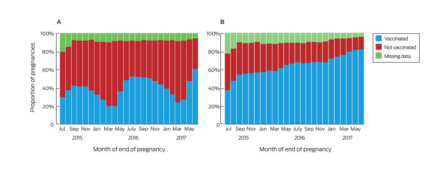 Uptake of pertussis vaccination by pregnant women in Victoria increased from 38% in July 2015 to 82% in June 2017, a higher rate than estimated for comparable countries (eg, United Kingdom, 2017: 72%; United States, 2017: 49%).6,7 Uptake of influenza vaccination was only 39% during 2015–17, similar to estimates in other countries with comparable programs;7,8 however, the rate varied seasonally, typically rising to more than 50% during winter and spring, with coverage reaching 60% during the severe 2017 influenza season.