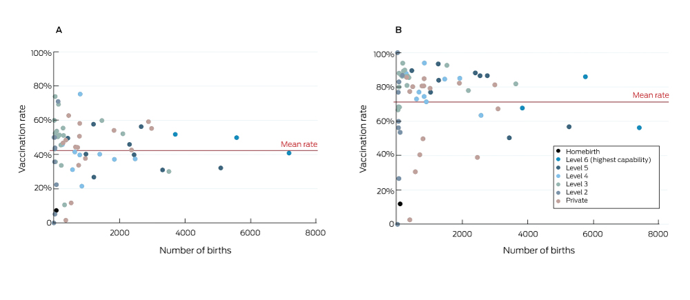 Uptake varied considerably between hospitals (Box 3). After excluding 194 pregnancies for which hospital data were missing, the median influenza vaccination coverage for pregnancies that ended during 2016–17 was 45.0% (IQR, 34.7–52.6%; range, 0–75.3%). For pertussis vaccination, median coverage was 80.4% (IQR, 65.1–86.3%; range; 0–100%). The proportions of women whose pregnancies ended at home who were vaccinated during pregnancy were low (influenza, 7%; pertussis, 12%). In one capability level 6 hospital and two capability level 5 hospitals with a total of 16 000 births annually, overall uptake of pertussis vaccination was about 55%; that is, about 7200 women whose pregnancies ended at these three hospitals were not vaccinated against pertussis.
