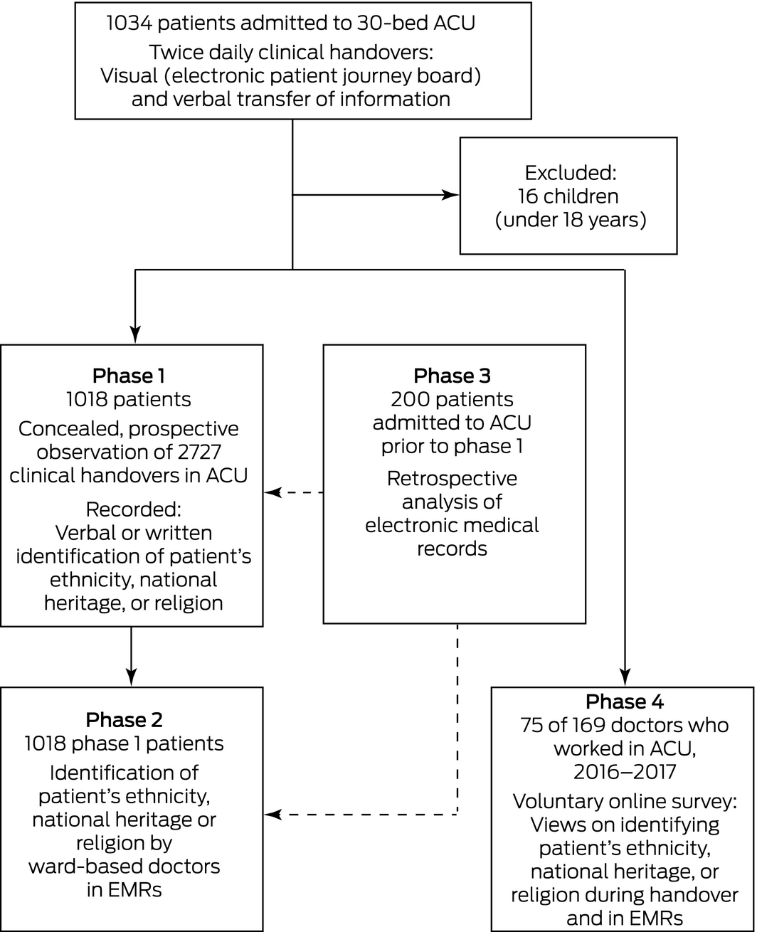 Box 1 – Identifying the cultural heritage of acute care unit (ACU) patients during medical handovers and in hospital electronic medical records (EMRs): the four phases of our observational study