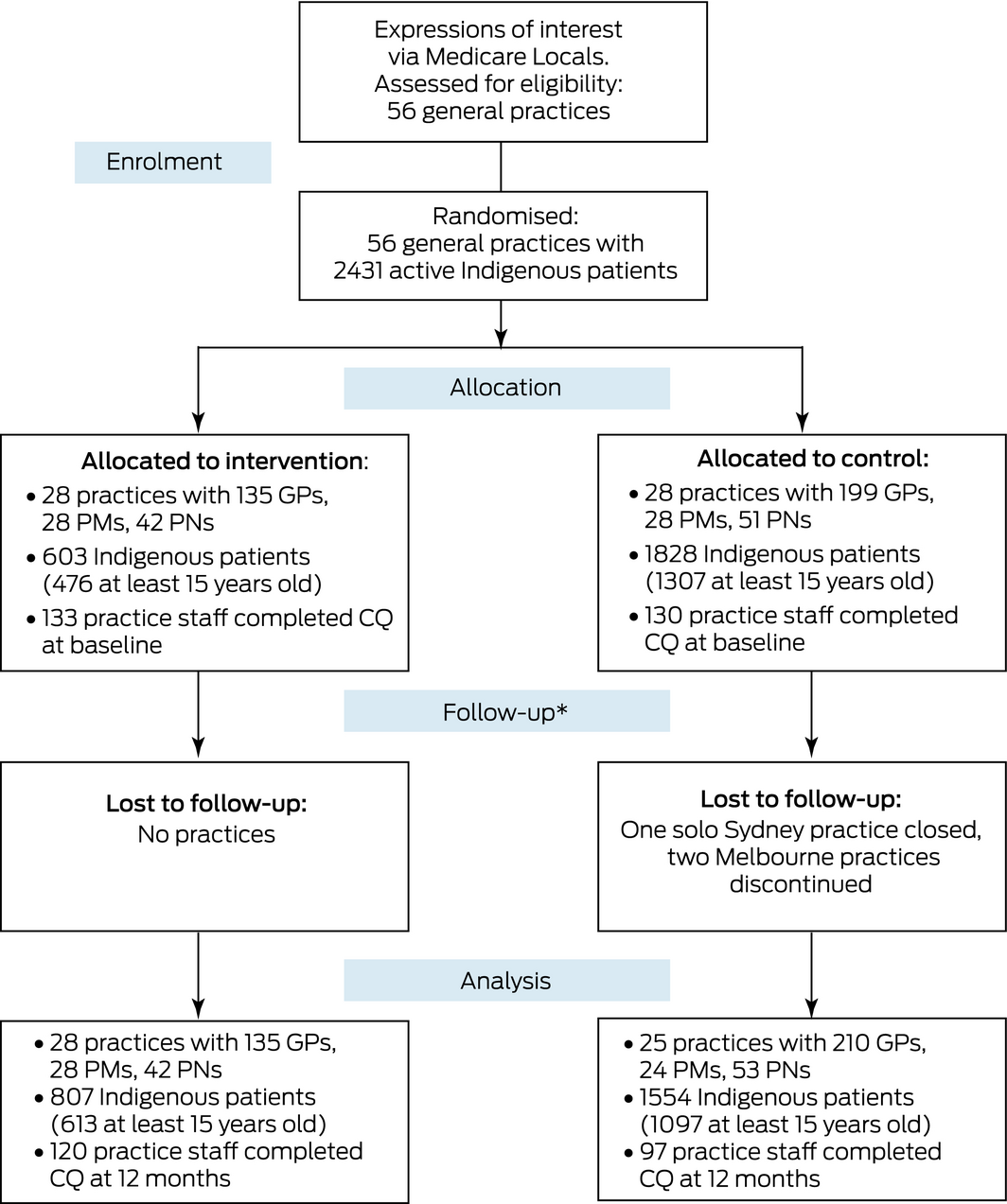 Recruitment started in June 2014 and data collection was completed in May 2017. Twenty‐eight practices each were allocated to the intervention (135 GPs, 603 Indigenous patients at baseline) and control groups (199 GPs, 1828 Indigenous patients at baseline). Three control practices (one in Sydney, two in Melbourne) were lost to follow‐up at 12 months, but no intervention practices (Box 1).