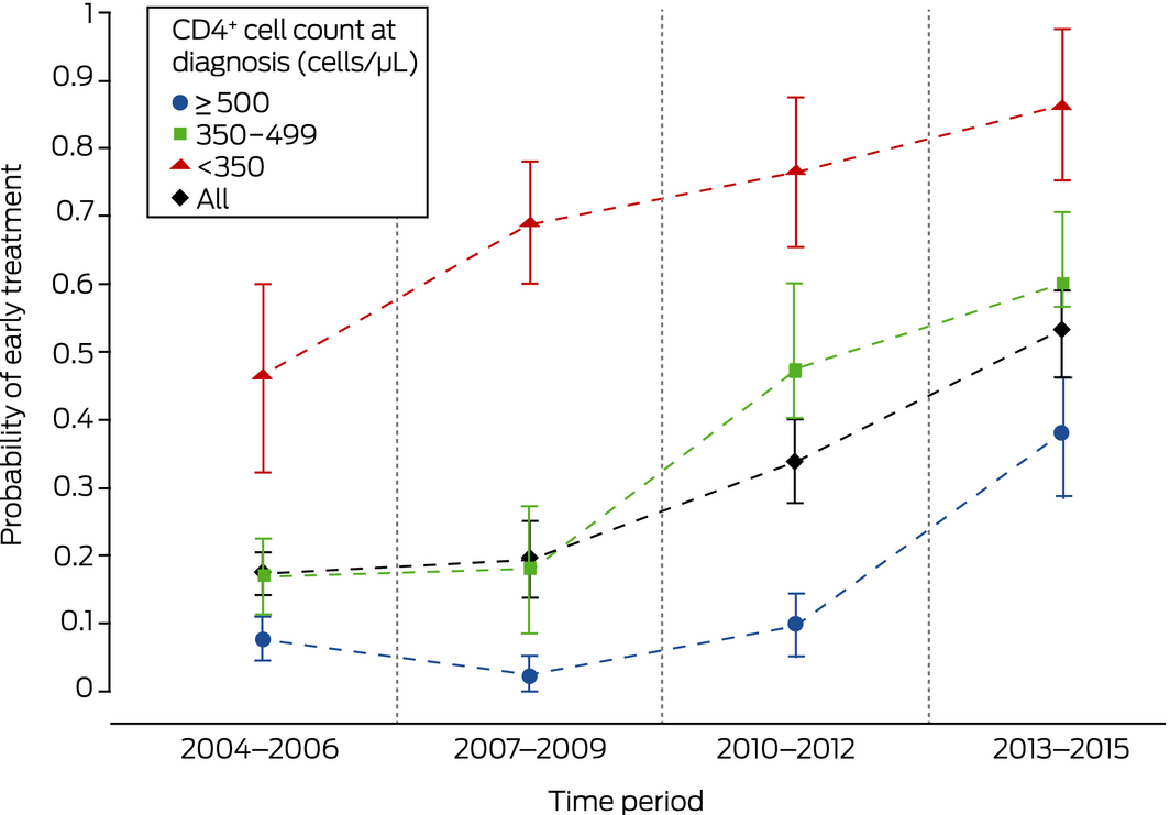 During 2004–2006, in keeping with then current treatment guidelines, patients with advanced infection (lower CD4+ cell count at diagnosis) were treated early, but treatment was deferred for those with less advanced disease. By 2013–2015, an increasing proportion of patients with higher CD4+ cell counts were receiving early treatment. Offering antiretroviral therapy to all patients with HIV infections has been recommended in Australia since June 2015.23 While the strength of evidence ratings for the influential US guidelines were upgraded in January 201624 and some Australian physicians will have anticipated the changes, the final period in our study included patients diagnosed before they were published. We therefore expect further increases in the median CD4+ cell count at diagnosis and the pre‐treatment nadir.