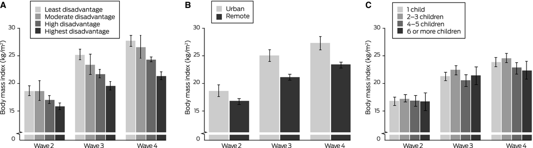 Box 2 – Relationship between body mass index and socio‐economic variables in the Australian Aboriginal Birth Cohort study.* A. Residence at birth: IRSEO; B. Residence at birth: remoteness; C. Mother's parity at birth