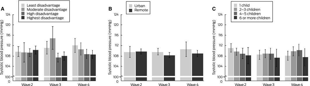 IRSEO = Indigenous Relative Socioeconomic Outcomes. * Least square means with 95% confidence intervals. Linear mixed models also included sex, study wave, and body mass index as variables. Interactions: wave*IRSEO, P = 0.36; wave*remoteness, P = 0.85; wave*parity, P = 0.022.