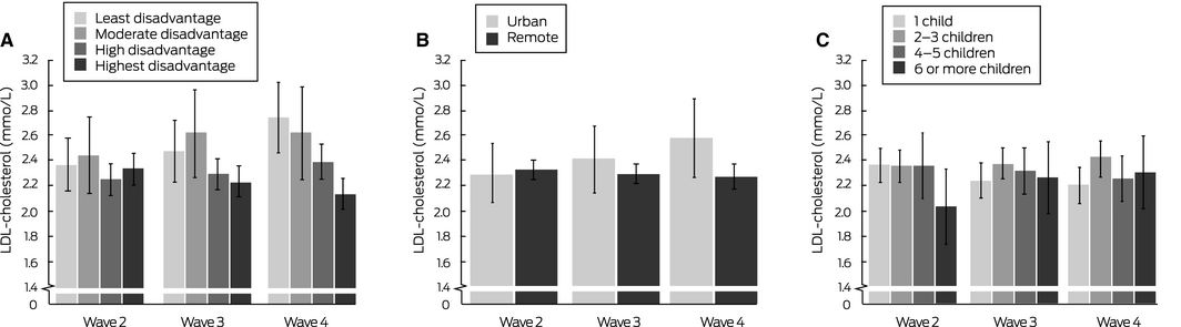 Earlier studies have consistently found that neighbourhood factors influence the prevalence among adults of CVD and its risk factors.7,11 A Canadian study reported that children from disadvantaged neighbourhoods were more likely than those from less disadvantaged areas to have CVD risk factors or events during 34 years of follow‐up.11 In the Cardiovascular Risk in Young Finns study, neighbourhood socio‐economic disadvantage across life was associated with higher blood pressure and triglyceride levels in midlife.7 We found, in contrast, that systolic blood pressure and LDL‐cholesterol levels were lower among people from areas of highest disadvantage. However, the prevalence among Indigenous Australians of small, dense LDL particles is high;12 we did not have data for evaluating this phenomenon. Our findings regarding HDL‐cholesterol and triglyceride levels were consistent with previous reports7,13 that they are most favourable in people from least disadvantaged areas (HDL‐cholesterol) and from urban places of residence (triglycerides).