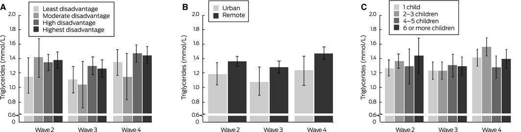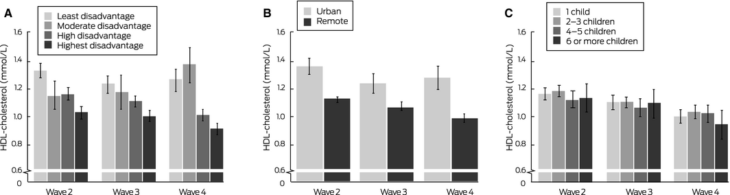 For Indigenous Australians, neighbourhood disadvantage is inversely and urban residence directly associated with positive scores on an American Heart Association index of ideal cardiovascular health.20 As we have found that greater neighbourhood disadvantage and remoteness were favourably associated with some characteristics (blood pressure, LDL‐cholesterol levels) and unfavourably with others (HDL‐cholesterol, triglyceride levels), the underlying reasons for these associations probably include non‐dietary factors. The importance of social factors — education, inequities in resource allocation, employment opportunities, physical infrastructure — must also be taken into account.21 Finally, genetic and inflammatory factors play important roles in determining serum lipid levels in Indigenous Australians.22 In a medium‐sized study in southeast Queensland (N = 155), apolipoprotein E4 polymorphisms associated with high triglyceride and low HDL‐cholesterol levels were 80% more frequent among Indigenous than among non‐Indigenous participants.23