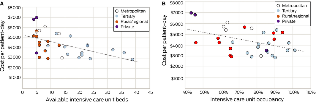 Intensive care unit (ICU) care is expensive.1 We estimated the financial costs, from an operational perspective, of providing care to patients admitted to Australian ICUs and how they vary according to bed number, unit occupancy, and ICU type (tertiary, metropolitan, and rural/regional public hospitals, and private hospitals).