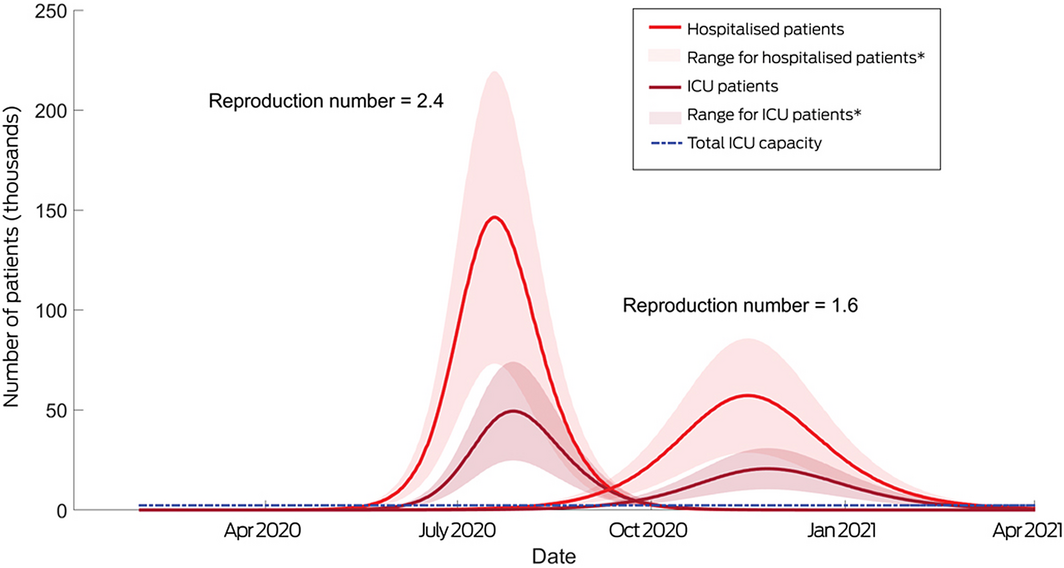 Applying the Imperial College model, the peak demand for intensive care in NSW would be at least 6965 beds if mitigation efforts — isolation of people with confirmed COVID‐19, household quarantine of their contacts, social distancing from people over 70 years of age — are implemented, or almost eight times as many as the baseline number; without mitigation, more than three times as many ICU beds (21 283) could be required (Box 1).