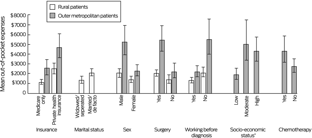 Among rural participants, mean out‐of‐pocket expenses were higher for men ($1988; 95% CI, $1605–$2461 v $1362; 95% CI, $1092–$1699), for people with private health insurance ($2455; 95% CI, $1973–$3053 v $1103; 95% CI, $877–$1386), and for people who were married ($2086; 95% CI, $1749–$2489 v $1297; 95% CI, $975–$1725), had undergone surgery ($1990; 95% CI, $1684–$2351 v $1360, 95% CI, $1005–$1839), or had worked prior to being diagnosed with cancer ($2084; 95% CI, $1643–$2644 v $1298; 95% CI, $1038–$1625) (Box).