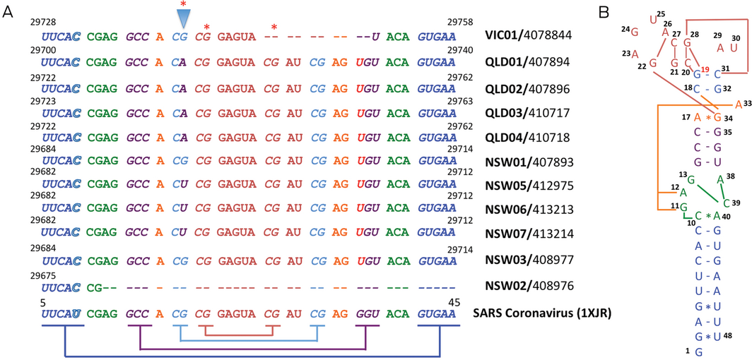 Up to 29 April, 1319 sequences of the Australian SARS‐CoV‐2 isolates are available in the website of the Global Initiative on Sharing All Influenza Data (GISAID).3 Except for the NSW03 and NSW01 isolates, viral mutations are located at the stem‐loop II motif (s2m), an extremely conserved RNA element in the 3’ untranslated region (3’‐UTR) (Box, A). The NSW02 and VIC01 isolates have deletion of 41 and ten nucleotides respectively. All Queensland cases have single G‐to‐A substitution (nucleotides 29714/QLD01, 29736/QLD02, 29736/QLD04, and 29737/QLD03). Moreover, patients with NSW05, NSW06, NSW07, NSW15, NSW18, NSW19, NSW21, NSW24, NSW26, NSW28, or NSW31 (nucleotide 29696) have single G‐to‐U substitution at the same nucleotide. This substitution is only present in Australian patients and has not been found in SARS‐CoV‐2 isolates from other countries.
