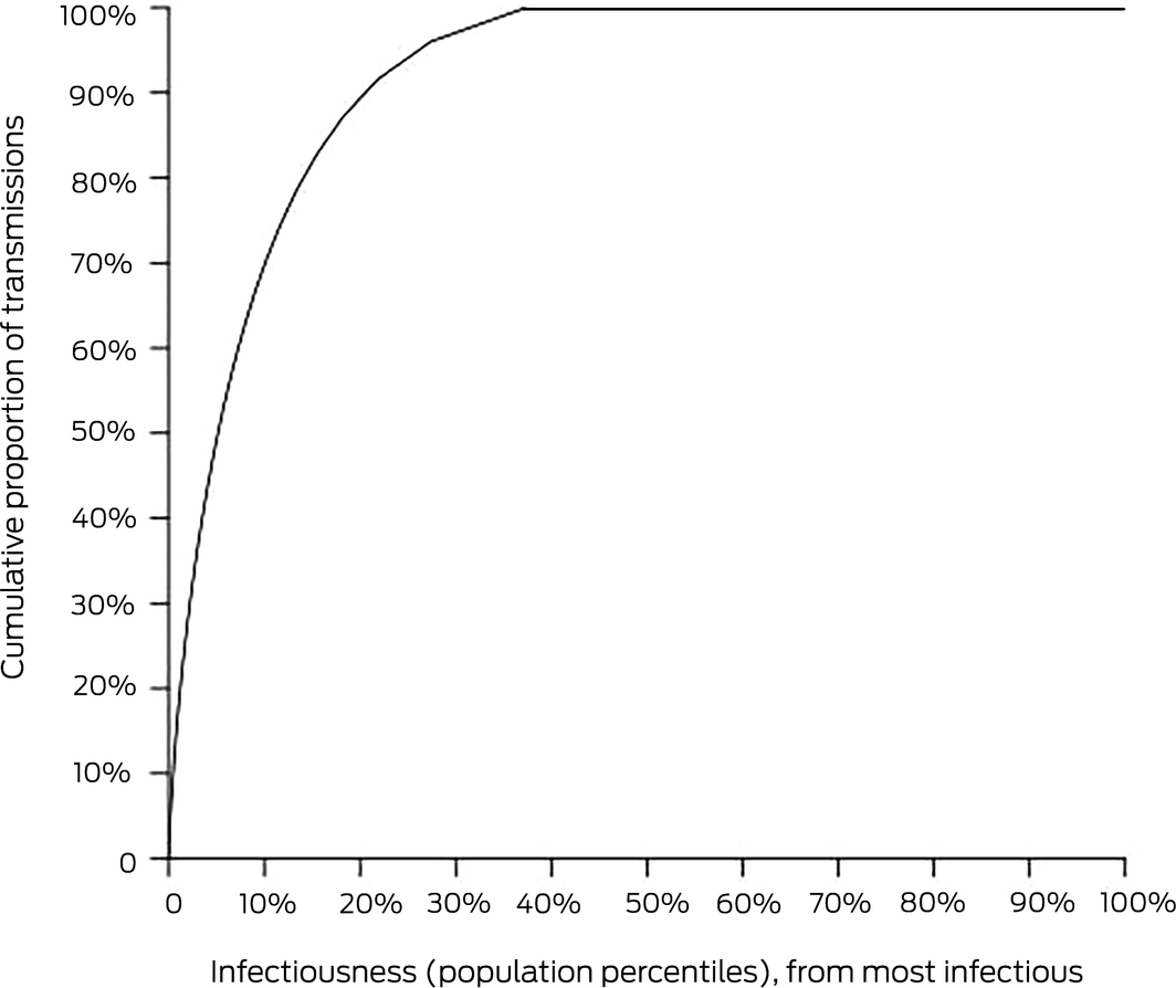 To take an extreme example, if superspreaders were all important, so that the basic reproduction number (R0; the average number of cases expected to occur as a result of infection by a single individual in a fully susceptible population) of 2.5 was made up of 1% of infected people, who each spread the disease to 250 others and 99% who spread the disease to nobody, then there is at least a 99% chance that any randomly chosen infected person will not generate ongoing transmission. Even if, as would happen 1% of the time, the initial infected person was a superspreader, all the secondary cases generated may be in non‐spreaders, or even if a superspreader or two were included, the following generation of infected people may include no superspreaders, and so on. Fortunately, there is an area of mathematics — branching processes — that allows us to calculate algebraically the probability that the disease will eventually die out without chasing down the endless possible permutations.9,10
