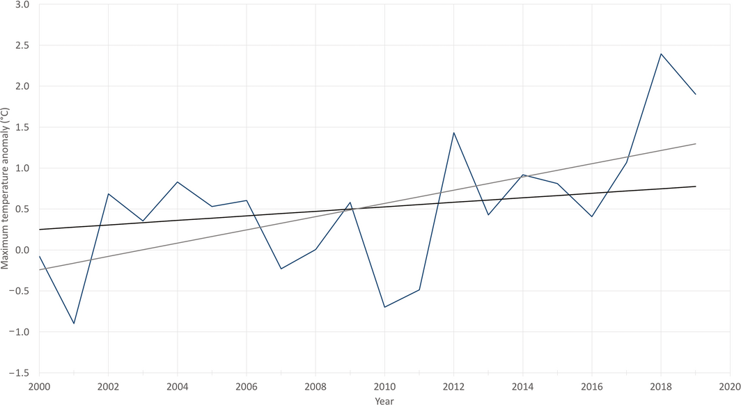 Box 1 – Nationally averaged Australian summer (December–February) maximum temperature anomalies for the past 20 summers (2000–2001 to 2019–2020)*