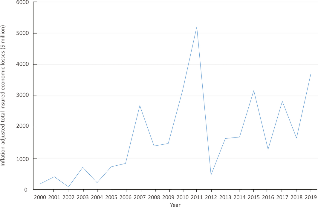 Box 5 – Annual inflation‐adjusted total insured economic losses in Australia from bushfires, cyclones, flooding, hailstorms, storm flooding, and tornadoes for the period 2000–2019 based on the Historical Catastrophe Database of the Insurance Council of Australia (ICA)