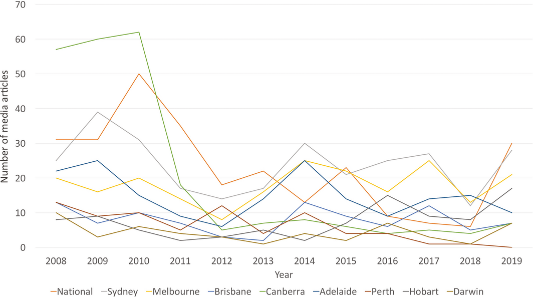 This indicator continues to track Australian media coverage on health and climate change. We used the same methods as reported previously, analysing 13 national and regional high circulation English‐language newspapers from 2008 to 2019, as well as Australian Broadcasting Corporation (ABC) online news and transcripts of the ABC online programs.1 It is clear that the extreme heat and bushfires of 2019 have resulted in increased media engagement with health and climate change. With 127 pieces in 2019, the total number of newspaper articles on health and climate change was almost double the number (n = 65) in 2018. National newspapers have had the most growth, followed by newspapers in Sydney and Hobart (Box 6). At the same time, online coverage from the ABC on health and climate change has more than tripled (Supporting Information 5.1 and figure A2).