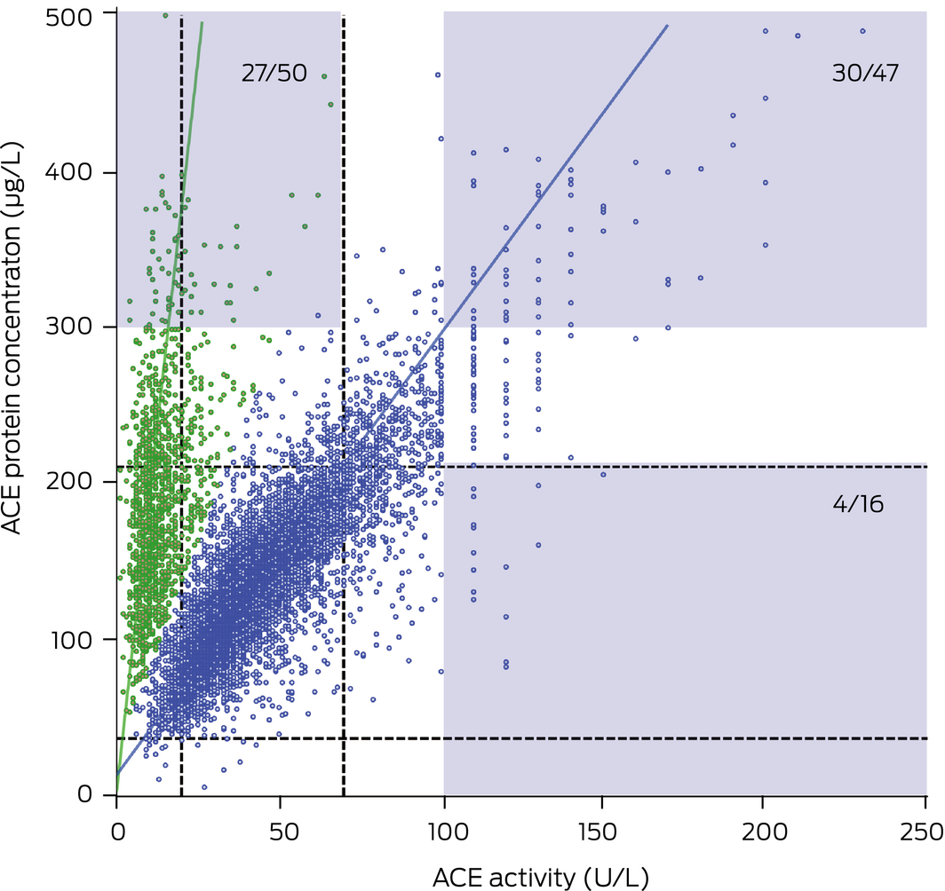 Pathology test reference intervals are indicated by the dotted lines. The shaded areas indicate result pairs included in the clinical audit (numbers of patients with sarcoidosis/total number audited). Blue: ACE activity not affected by ACEI therapy; 7536 samples, R2 = 0.71. Green: ACE activity affected by ACEI therapy; 1346 samples, R2 = 0.21.