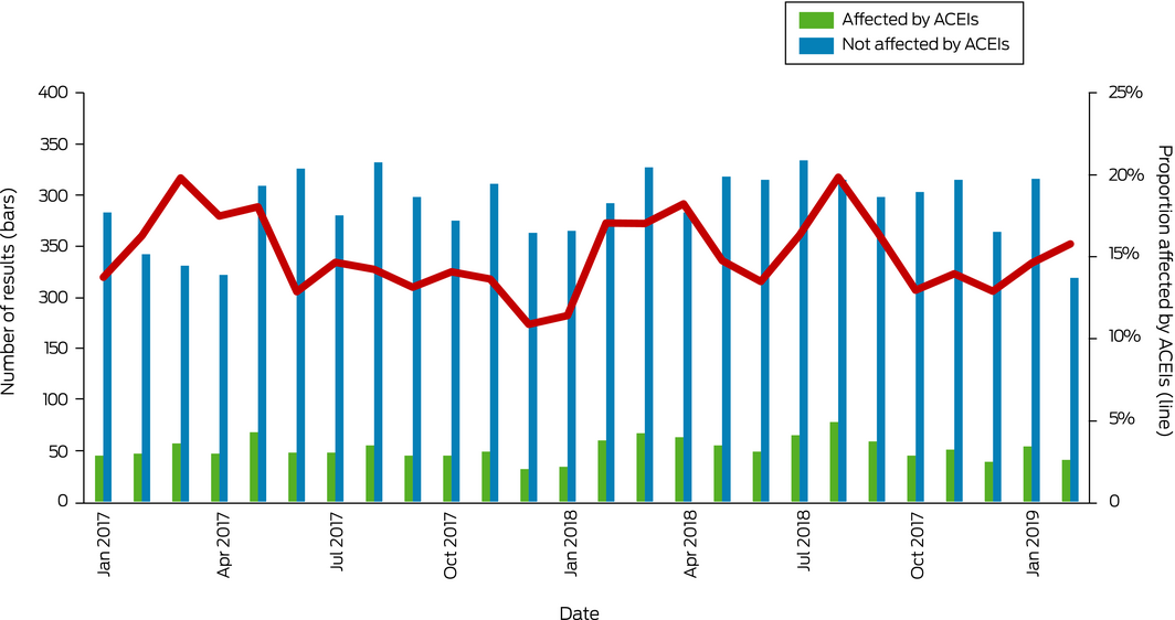 A total of 8882 paired test results were retrieved from the Pathology Queensland database for 4206 women (median age, 53.3 years; interquartile range [IQR], 36.0–65.6 years) and 4014 men (median age, 55.2 years; IQR, 42.2–67.3 years). Two discrete populations were evident in the scatterplot of paired results; for 1346 pairs (15.2%; 95% CI, 14.4–15.9%; green in Box 1), ACE activity was low relative to ACE protein, pathognomonic of ACEI interference. The upper reference limits for the two tests and the regression line for samples not affected by ACEIs nearly intersected, suggesting the general biologic equivalence of the two analytic methods and that the discordant results were not attributable to mismatched reference limits (Box 1). The correlation of values for the unaffected samples was moderate (R2 = 0.71) and the differences between the methods greater than predicted by their variances (Supporting Information, figure), indicating that the assays were not interchangeable. The monthly rate of ACEI interference was fairly consistent throughout the study period, despite comments to requesting physicians about the discrepancy between activity and protein levels included in pathology laboratory reports (Box 2).