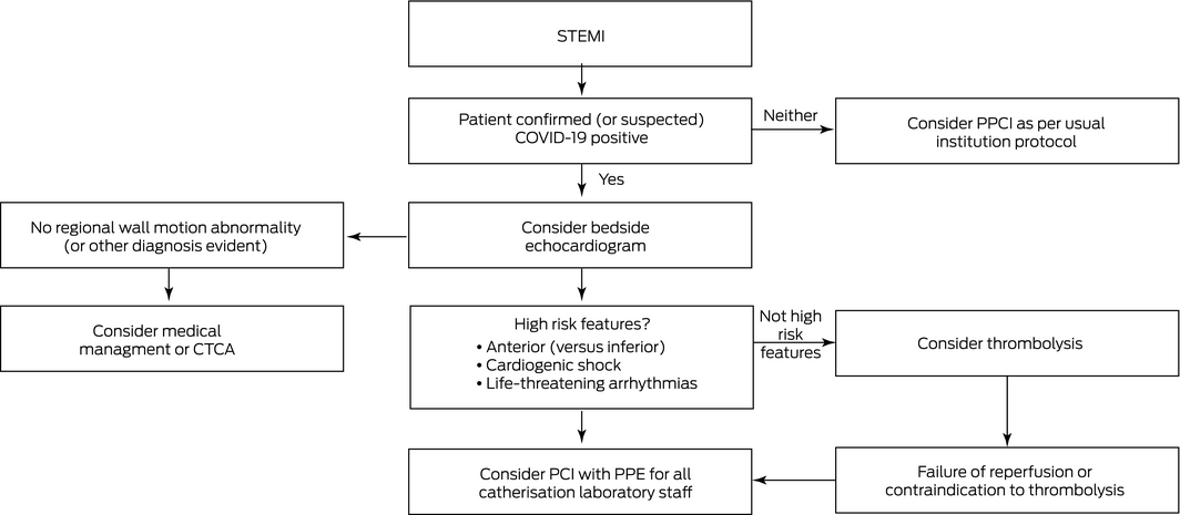 A critical concern during the COVID‐19 pandemic is use of the cardiac catheterisation laboratory (Box 3). Bringing a COVID‐19‐positive patient to the cardiac catheterisation laboratory exposes staff to the risk of infection, and prevents post‐procedure laboratory use pending a terminal clean. Delays are to be expected with primary PCI to allow for COVID‐19 assessment and infection control measures. ST elevation MI (STEMI) protocols from China and the US during the COVID‐19 pandemic have been published.23,29 The Sichuan Provincial People's Hospital proposed fibrinolytic therapy for all STEMIs, with suspension of their primary PCI service.29 This lysis protocol relied on rapid nucleic acid testing, which may be limited by individual hospital availability and policy. The US Cardiology Society recommended primary PCI continuation with appropriate PPE, and lysis for select cases.23 In Australia, each health care service will be different, but it is important that a local protocol is developed and adapted (Box 4), with CSANZ guidance available.34 Training in PPE, sourcing fibrinolytic medications and updating lysis protocols are critical. As COVID‐19 is associated with STEMI mimickers (ST elevation without obstructive coronary artery disease due to microvascular thrombosis or myocarditis), use of lysis may confer risk without benefit in some cases, exacerbated by COVID‐associated coagulation abnormalities.17,30 Bedside echocardiography to ascertain regional wall abnormalities and computed tomography coronary angiography to limit cardiac catheterisation laboratory staff exposure could all be considered.