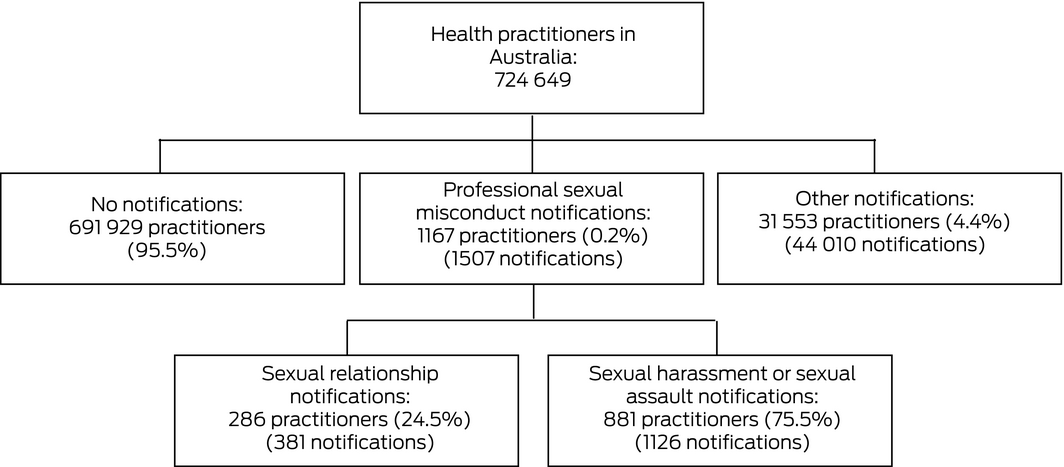 During 2011–2016, Australian regulators received 1507 notifications of sexual misconduct by 1167 of 724 649 registered health practitioners (0.2%) (Box 2); 208 of these practitioners (18%) were named in more than one allegation of sexual misconduct (Box 3).