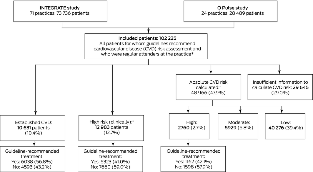 We therefore examined implementation of the 2012 CVD guidelines in general practice by analysing baseline electronic medical record (eMR) data from two clinical trials of computer‐supported interventions for improving CVD care conducted during 2015–2018, the INTEGRATE5 and Q Pulse studies.6 Our analysis is based on data for 102 225 patients from 95 general practices in four Australian states and territories. The study was approved by the Human Research Ethics Committees of the University of Sydney (reference, 2015/616) and the University of Notre Dame (reference, 014105S/016011S).