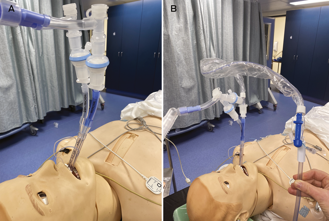 Suctioning of the lung is often required and we recommend using closed in‐line suction. This should be inserted with the ventilator disabled and the tube clamped to minimise aerosol generation (Box 2, B). The patient should be adequately paralysed to prevent coughing. Self‐sealing suction‐safe connectors can also be placed to minimise circuit disconnections.