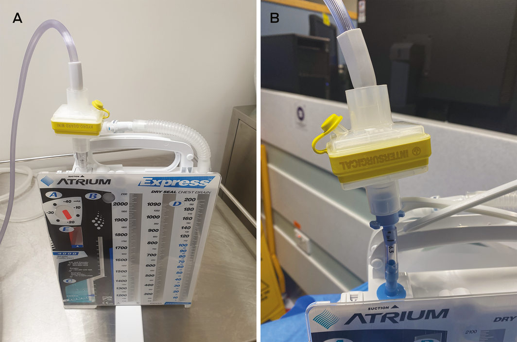 To minimise risk, a viral filter can be applied to the exhaust vent.22 Suction can then be connected to the filter exhaust (Box 3). The resistance of the viral filter up to a flow of 30 L/min has been found to be trivial, correlating with clinical experience that the filter does not impede airflow out of the chest.23 It is important, however, that filters be checked and changed daily.