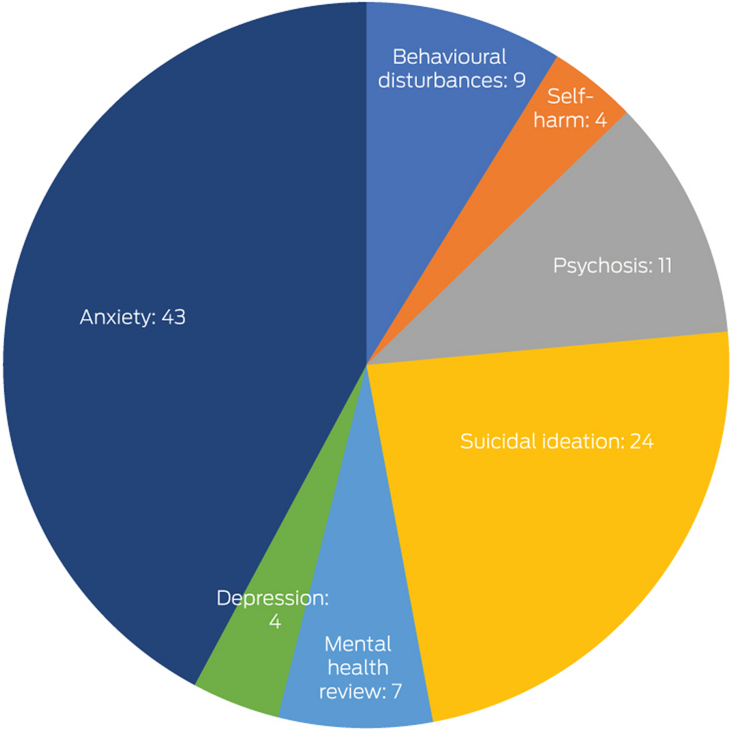 During June – September 2020, 2774 people were registered for accommodation in Special Health Accommodation hotels, of whom 461 (16.6%) presented at least once to the RPA ED (542 ED presentations in total). Thirteen patients (2.8%) were diagnosed with COVID‐19, none of whom required intensive care. The most frequent ED diagnosis categories were mental health (102 presentations, 19%) and cardiovascular conditions (84, 15%) (Box 1). The most frequent reasons for mental health presentations were anxiety (43 presentations), suicidal ideation (24), and acute psychosis (11) (Box 2). The median length of stay for presentations with mental health conditions (543 min; interquartile range [IQR], 372–788 min) was longer than for non‐mental health presentations (433 min; IQR, 302–598 min). Mental health‐related presentations were also associated with higher triage acuity: 86 presentations (84%) were deemed urgent or potentially life‐threatening, compared with 316 of the 440 ED presentations not related to mental health (72%). A larger proportion of mental health presentations were by patients with pre‐existing mental health conditions (65, 64% v 49 non‐mental health presentations, 11%).