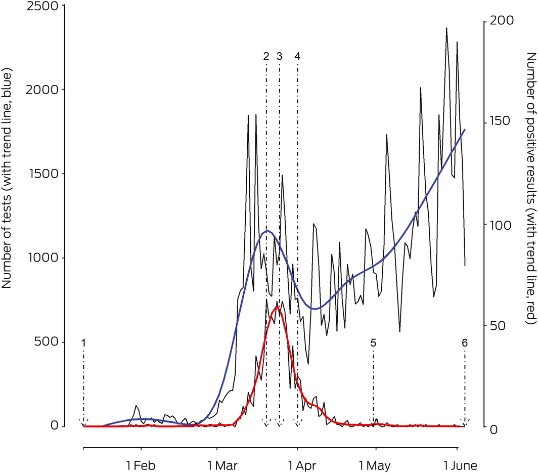 Box 1 – Numbers of SARS‐CoV‐2 tests processed by Queensland Health public laboratories and of people with positive results, 10 January – 4 June 2020, with trend lines and indications for testing*
