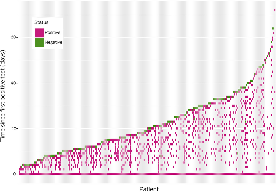Of the 958 people with positive test results, 317 (33.1%) had repeat tests. Of the 243 people with initial positive results and at least two repeat tests, 147 (60.5%) achieved negative status. The median age of those who achieved negative status was 45 years (IQR, 30–59 years; range 20–84 years); 94 were women, 53 men (OR, 1.7; 95% CI, 1.0–2.9). Of the 243 people who underwent two or more repeat tests, 224 (92.2%) had positive results beyond 10 days and up to 72 days after their initial tests (Box 2). Seven of 147 people who achieved negative status (5%) subsequently had positive test results, including six men.