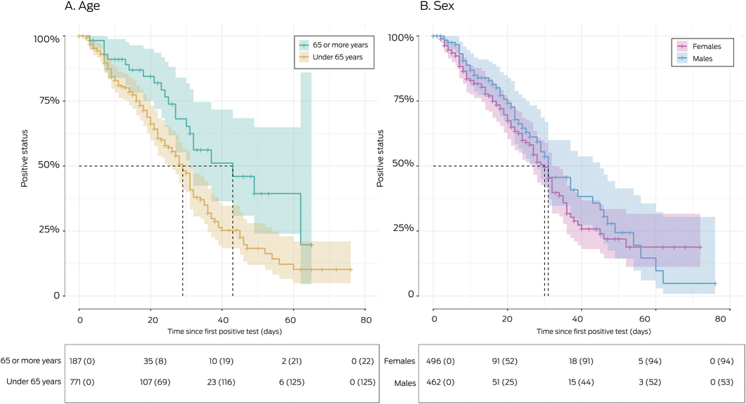 During the coronavirus disease 2019 (COVID‐19) epidemic, the continued presence of viral RNA in the upper airways of infected people has been reported.1 Such persistence does not necessarily signify active infection or that the virus can be transmitted.2 In Queensland, repeat testing for severe acute respiratory syndrome coronavirus 2 (SARS‐CoV‐2) in people with an initial positive test result was undertaken until June 2020, providing an opportunity to explore patterns of test positivity, apparent rates of clearance of viral RNA, and the extent to which each varied by the age and sex of the infected person.