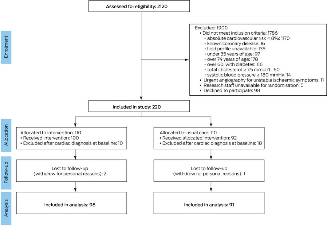 Patients who presented to the RACPC between 1 July 2014 and 31 December 2017 were screened by assessing their cardiovascular risk factors and estimating their 5‐year risk with the Australian absolute risk calculator (www.cvdch​eck.org.au). Inclusion criteria were age 35–74 years and estimated 5‐year cardiovascular risk of at least 8% (to maximise the recruitment of patients for whom a reduction in cardiovascular risk would be clinically significant); exclusion criteria were known cardiac disease and pregnancy. Patients from groups with clinically determined high risk of cardiovascular disease9 were also excluded, as they should be routinely receiving aggressive management. The intervention commenced with the initial review of patients, before they were investigated for ischaemia; enrolled participants were later excluded if the baseline clinical assessment identified cardiac causes for their symptoms, as these patients were deemed candidates for secondary, rather than primary, prevention.