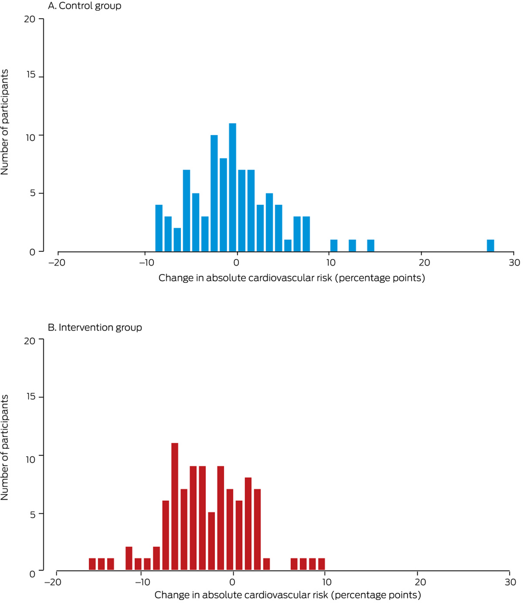 The absolute cardiovascular risk value at follow‐up for one patient in the control group was identified as a significant outlier. Their estimated minimal absolute cardiovascular risk at baseline was 14% (total cholesterol, 3.6 mmol/L; HDL cholesterol, 0.8 mmol/L; systolic blood pressure, 147 mmHg), and they were taking a statin and three anti‐hypertensive agents. The patient subsequently disengaged from medical treatment and ceased all medications. At 21‐month follow up, his estimated absolute cardiovascular risk was 42% (total cholesterol, 7.2 mmol/L; HDL cholesterol, 0.7 mmol/L; systolic blood pressure, 205 mmHg). In a sensitivity analysis excluding this patient, the between‐group difference in primary endpoint was similar to that in the main analysis (intervention v control, –2.4 percentage points; 95% CI, –1.1 to –3.6 percentage points).