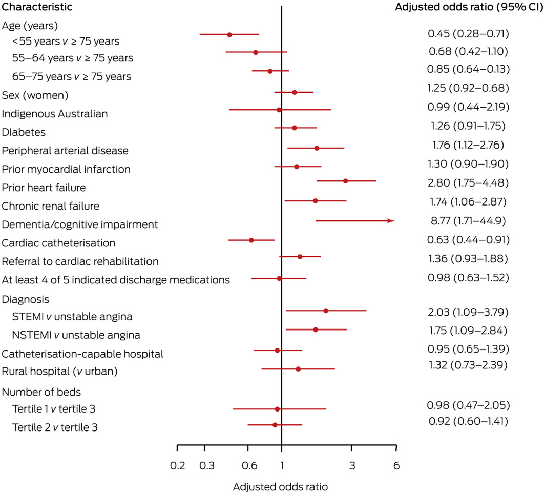 The odds of MACE by 6‐month follow‐up they were higher for older patients, for patients with diabetes mellitus, peripheral arterial disease, prior myocardial infarction or heart failure, or chronic renal failure, and for Indigenous Australian patients; they were higher for patients diagnosed with STEMI or NSTEMI than for those diagnosed with unstable angina (Box 7).