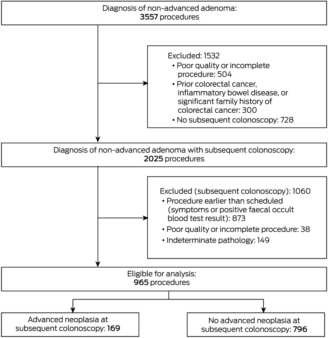 We extracted outcomes data for people who underwent colonoscopy during January 1999 – November 2016, including the quality of procedure and pathology. If non‐advanced adenoma was identified, we reviewed subsequent colonoscopies for findings of advanced neoplasia. Exclusion criteria included incomplete colonoscopy (caecum not reached or incomplete polyp resection), poor bowel preparation, a family history of colorectal cancer (conferring increased or high risk status, according to Australian guidelines17), prior resection of colorectal cancer, or a history of inflammatory bowel disease. Any subsequent colonoscopy performed earlier than scheduled (within 4.5 years of the preceding colonoscopy) because of gastrointestinal symptoms or positive faecal occult blood test results was also excluded, as the first procedure may have been inadequate in these cases.