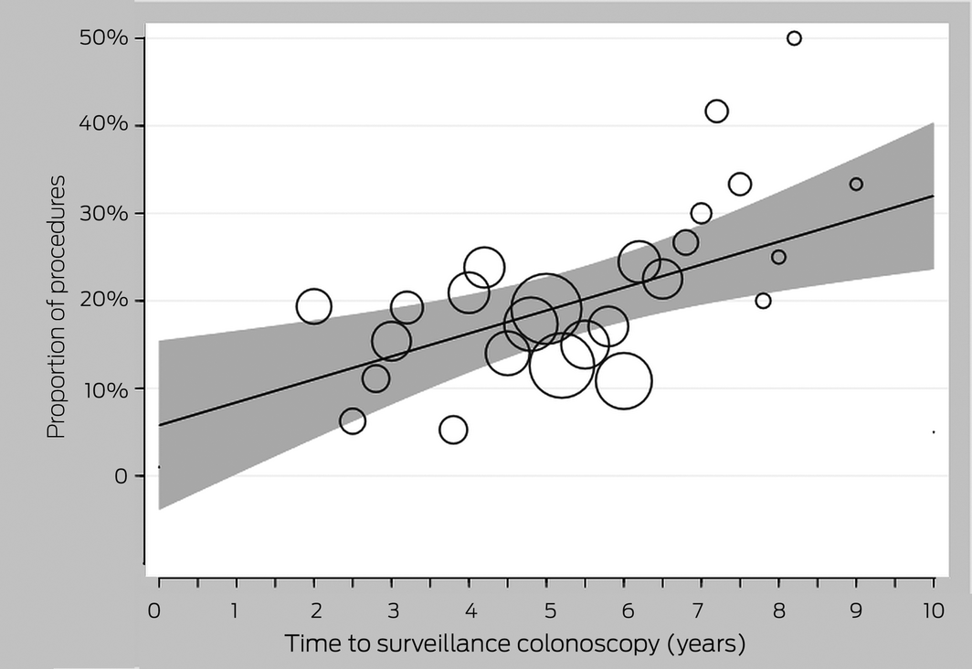 Box 3 – Proportions of procedures with advanced neoplasia at surveillance colonoscopy after non‐advanced adenoma removal, by time to surveillance colonoscopy: regression analysis