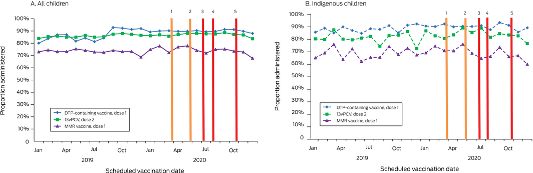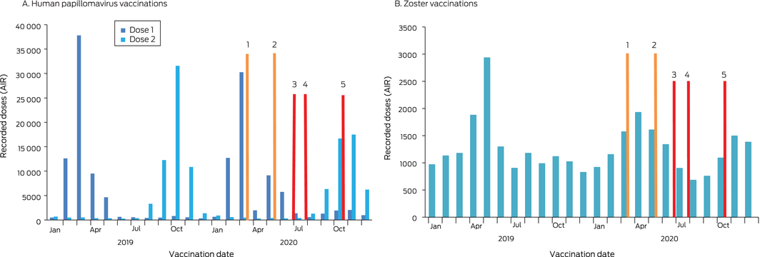 HPV dose 1 vaccination of adolescents declined noticeably during the first but not the second epidemic wave, probably because the Victorian health department engaged with local councils to facilitate alternative delivery arrangements and supported general practitioners with promoting catch‐up vaccination by providing mainstream and social media information and resources for providers and parents.7 Zoster vaccination of older people, particularly Indigenous Australians, was also lower than usual, perhaps because they delayed routine vaccination as the result of concerns about the COVID‐19 infection risk.