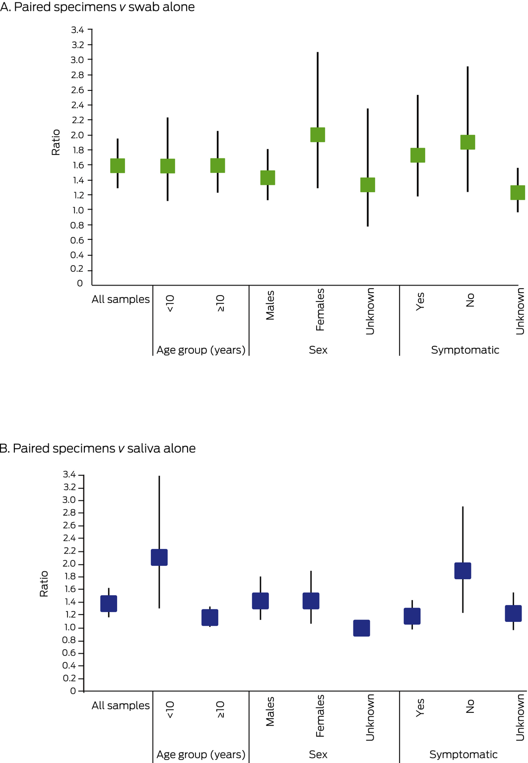 For 19 of 54 participants with positive SARS‐CoV‐2 test results, both specimens were positive (35%), in 20 cases only the saliva test result was positive (37%), and in 15 cases only the oropharyngeal‐nasal swab test result was positive (28%) (Box 1). Adding a paired saliva specimen to standard‐of‐care oropharyngeal‐nasal swab testing increased total case detection by 59% (95% CI, 29–95%); it increased case detection by 90% (95% CI, 24–191%) in asymptomatic people and by 100% (95% CI, 29–210%) in females. Adding a paired oropharyngeal‐nasal swab to a single saliva specimen increased overall total case detection by 38% (95% CI, 17–63%), but only by 17% (95% CI, 2–34%) in people aged 10 years or more (Box 3).