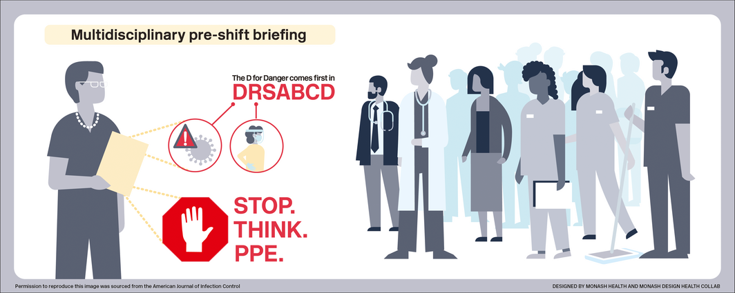 At Monash Health, we used multidisciplinary shift briefings to ensure all health service team members were included in the information and safety messages.3 Human factor‐designed briefing cards, based on the airline industry pre‐flight safety cards, were used to ensure consistent messaging (Box and online Supporting Information). The early involvement of a design team, from the Design Health Collab at Monash University, ensured clear and unambiguous messaging to health care workers. The images were designed to represent diversity in gender, race and role to ensure all health care workers would see themselves reflected in the briefing card and that the safety messages were relevant and directed towards them. Providing information that is timely and accessible as well as readable and visually clear is important.4