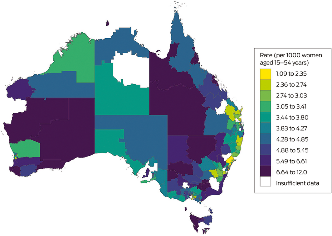 We used the lack of MS‐2 Step prescribing by GPs in an SA3 as a surrogate marker of GPs not providing early medical abortion. However, that GPs had not prescribed and pharmacists had not dispensed MS‐2 Step in some rural and remote SA3s could have a number of explanations. Firstly, rural and regional doctors may have concerns about support services, including after‐hours emergency and surgical care in case of complications, and about access to ultrasound services (recommended for gestation dating and to exclude ectopic pregnancy8,23). They might also have been concerned about their capacity to provide anti‐D, but recently updated guidelines no longer recommend the routine use of RhD immunoglobulin in medical terminations before ten weeks’ gestation.1 Early medical abortion can proceed without ultrasound assessment after careful screening for risk factors for ectopic pregnancy and when the gestational age can be accurately estimated on the basis of the woman’s history.24 Secondly, many doctors conscientiously object to performing abortions, and some refuse to refer patients for such procedures, despite a legal obligation to do so.25 Thirdly, many GPs do not have the training or knowledge required to confidently provide early medical abortion.25 Finally, women may choose not to use local GP providers for abortion services.