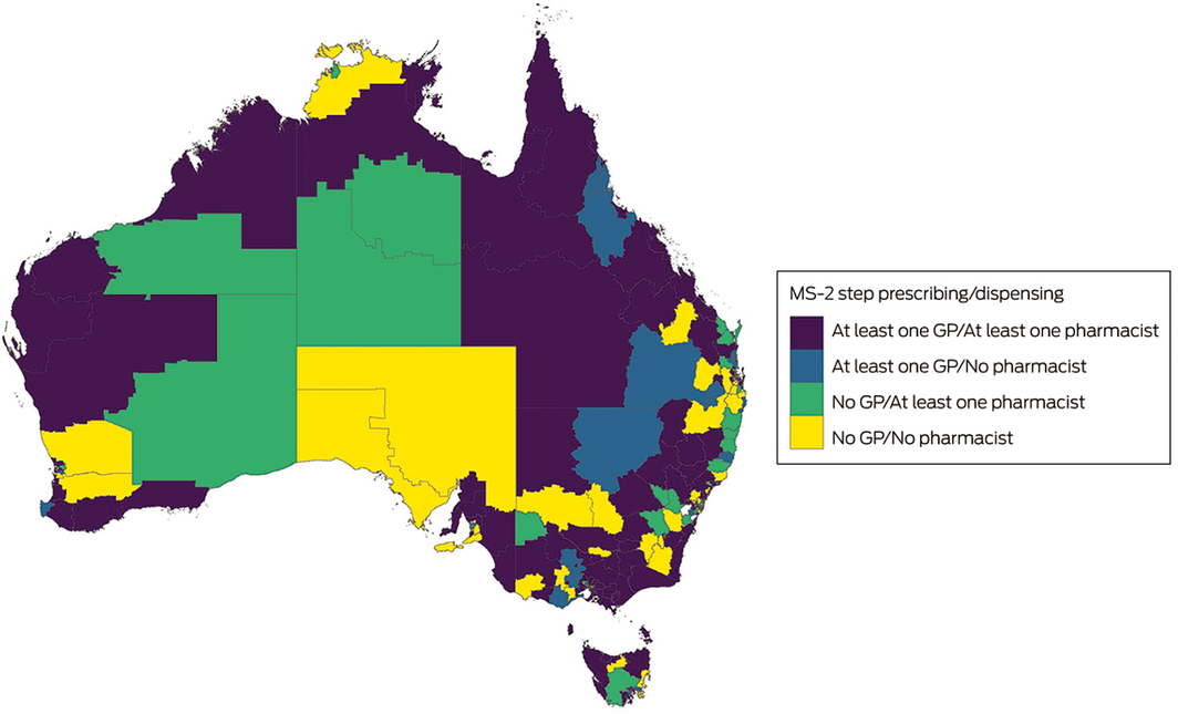 Conclusions: The rate of early medical abortion is greater among women in remote, outer regional, and inner regional Australia than in major cities, but a considerable proportion of women live in areas in which MS‐2 Step was not locally prescribed or dispensed during 2019. Supporting GPs in the delivery of early medical abortion services locally should be a focus of health policy.