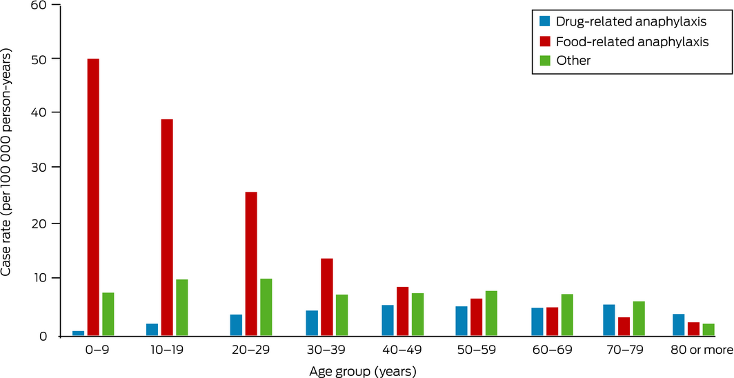 The overall rate of anaphylaxis during 1 November 2018 – 31 December 2020 was 31.9 episodes per 100 000 person‐years. Rates of food‐related anaphylaxis were highest among people aged 0–39 years (median age, 17 years; IQR, 6–29 years), and those of drug‐related anaphylaxis among people aged 40–79 years (median age, 45 years; IQR, 30–60 years) (Box 2).