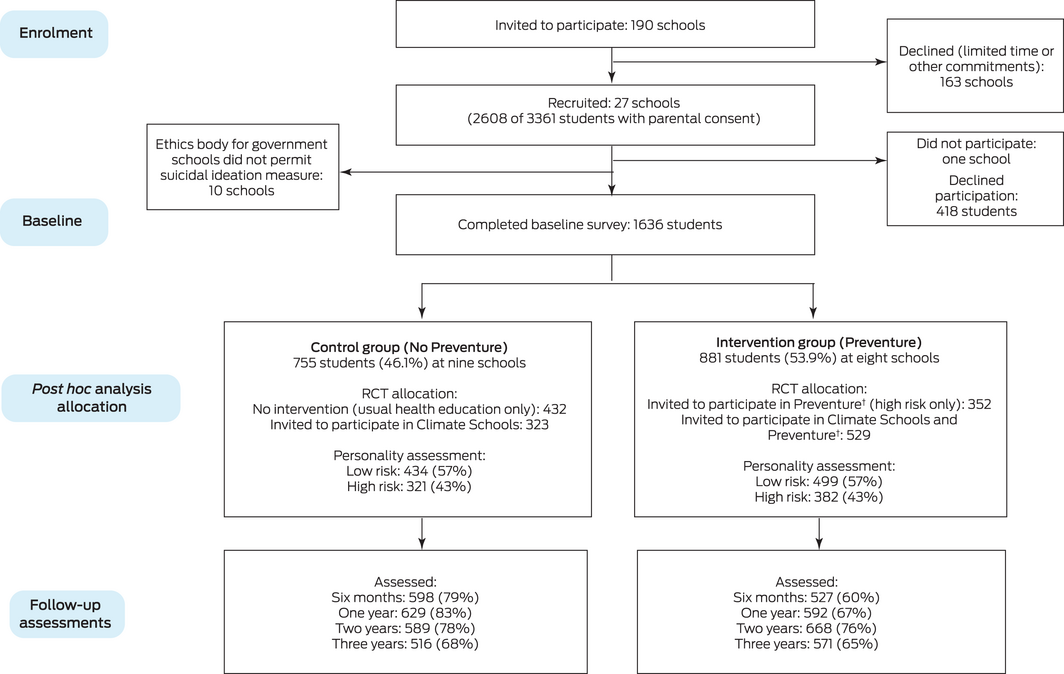 First, as most people with suicidal ideation do not attempt suicide, suicidal ideation is not a direct measure of harm. However, it is associated with increased risk of attempting suicide;26 an analysis of World Mental Health survey data from 17 countries (2001–2003) found that 29% of people who reported suicidal ideation later attempted suicide.27 Second, the CAP trial was not powered to assess interactions between trial group and personality in post hoc subgroup analyses. Third, our analysis was restricted to non‐government schools because of ethics‐related restrictions on assessing suicidal ideation in government schools, and we tested the efficacy of Preventure in year 8 students only; further studies could include public schools and older adolescents. The representativeness of our post hoc groups was also affected by the differing sex distribution in our groups (33% boys in the control group, 83% in the intervention group; mitigated by adjusting the final model for sex), and the different proportions of the CAP study sample included in the post hoc analysis (control: 755 of 1103, 68%; intervention: 881 of 1087; 81%). One‐third of students in the intervention group did not receive Preventure in full, and 27% did not receive it at all. However, our intention‐to‐treat analysis was a strength; that is, students in the intervention group who did not receive the Preventure intervention, or did not receive it in full, were included in the analysis. Further, we did not take the severity of reported suicidal ideation into account. Finally, follow‐up concluded in 2015, and suicidal ideation in more recent times was not assessed. However, given reported changes in adolescent mental health since 2015,28 the need for a selective approach to reducing suicidality in young people has not declined.