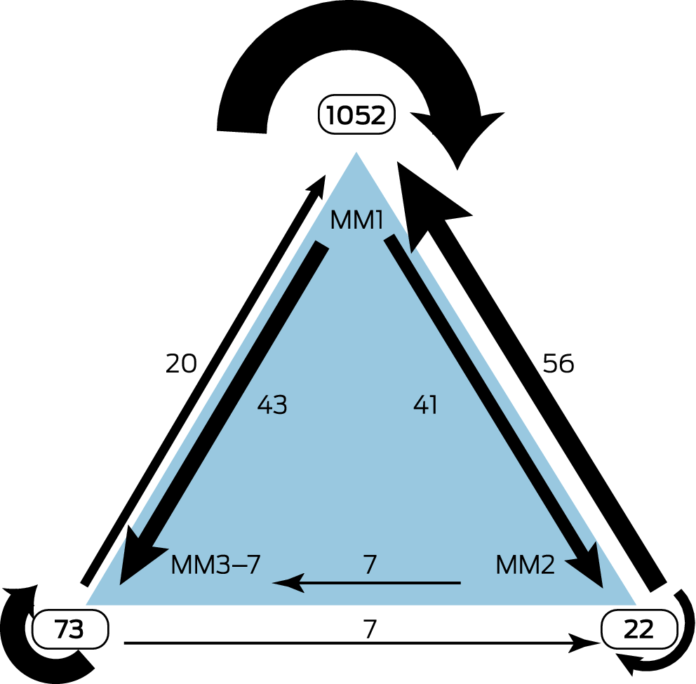Five years after graduation, 1136 doctors practised in metropolitan locations (86.0%), 85 in regional locations (6.4%), and 100 in rural locations (7.6%); eight years after graduation, 1128 practised in metropolitan locations (85.4%), 70 in regional locations (5.3%), and 123 in rural locations (9.3%) (Supporting Information, table). Forty‐three graduates (3.8%) had moved from metropolitan to rural practice, and twenty (20%) from rural to metropolitan practice; 97 graduates moved between metropolitan and regional practice (7.9%), and 14 between regional and rural practice (7.6%). Concordance of practice location classification five and eight years after graduation was 92.6% for metropolitan practice (1052 graduates), 26% for regional practice (22 graduates), and 73% for rural practice (73 graduates) (Box 1; Supporting Information, figure).
