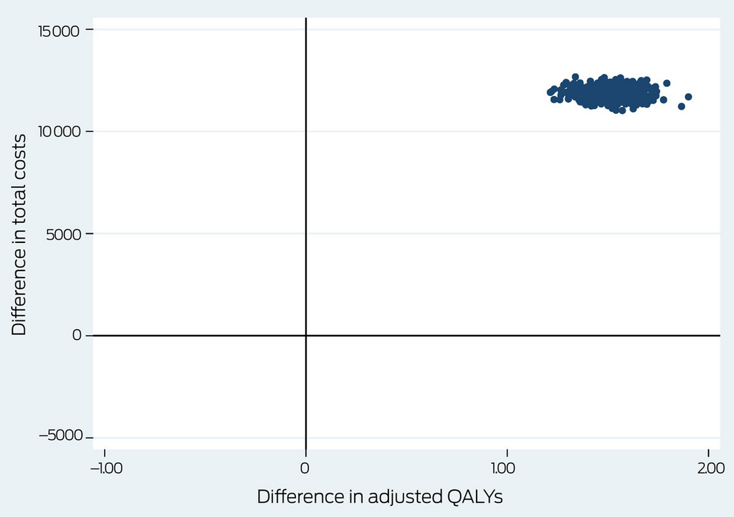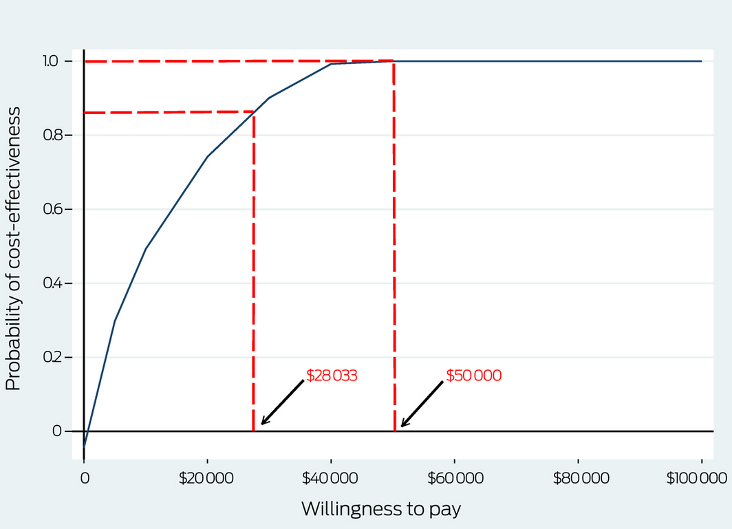 Secondary outcomes of the cost–utility analysis were the incremental costs per QALY gained (the incremental cost‐effectiveness ratio, ICER), defined as the differences in costs between the intervention and control groups divided by the difference in QALY gain. We used published willingness‐to‐pay thresholds of $28 03315 and $50 000 per QALY gained12 for cost‐effectiveness decision‐making. We employed bootstrapping to account for uncertainty related to sampling variation in the ICER; 5000 paired estimates of mean differences in costs and outcomes were derived, and the bootstrapped pairs plotted in a cost‐effectiveness plane. The probability of the intervention being cost‐effective at different willingness‐to‐pay thresholds is presented in a cost‐effectiveness acceptability curve.