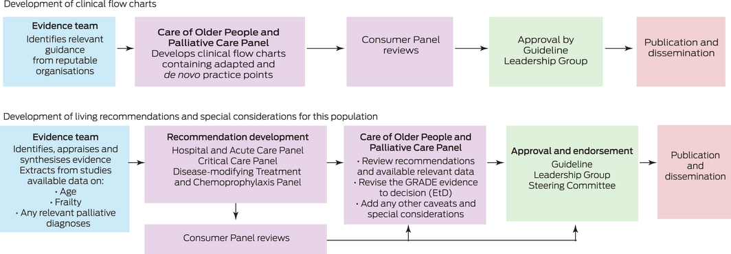 The National COVID‐19 Clinical Evidence Taskforce (the Taskforce) was established in March 2020 to give reliable, up‐to‐date advice to clinicians providing frontline care during the COVID‐19 pandemic. The Taskforce is comprised of 32 peak health professional bodies across Australia whose members provide clinical care to people with COVID‐19, including the Australian Association of Gerontology, the Australian COVID‐19 Palliative Care Working Group and the Australian and New Zealand Society for Geriatric Medicine. The Taskforce is managed in partnership with Cochrane Australia and the Australian Living Evidence Consortium. Systematic reviewers and guideline methodologists are charged with continually identifying, evaluating and synthesising the new research evidence. The evidence is then reviewed by one of the eight panels of clinical experts following rigorous, transparent methods based on the Grading of Recommendations Assessment, Development and Evaluation (GRADE) framework to develop evidence‐based guidance. The guidance follows a living guideline approach, which means that it is updated continually as new evidence emerges.4 Living guideline outputs are approved by the Guideline Leadership Group and endorsed by the Steering Committee, which consists of representatives from the member professional bodies. The guideline recommendations are also reviewed by a Consumer Panel, convened in collaboration with the Consumers Health Forum of Australia to provide consumer input on preferences and values.