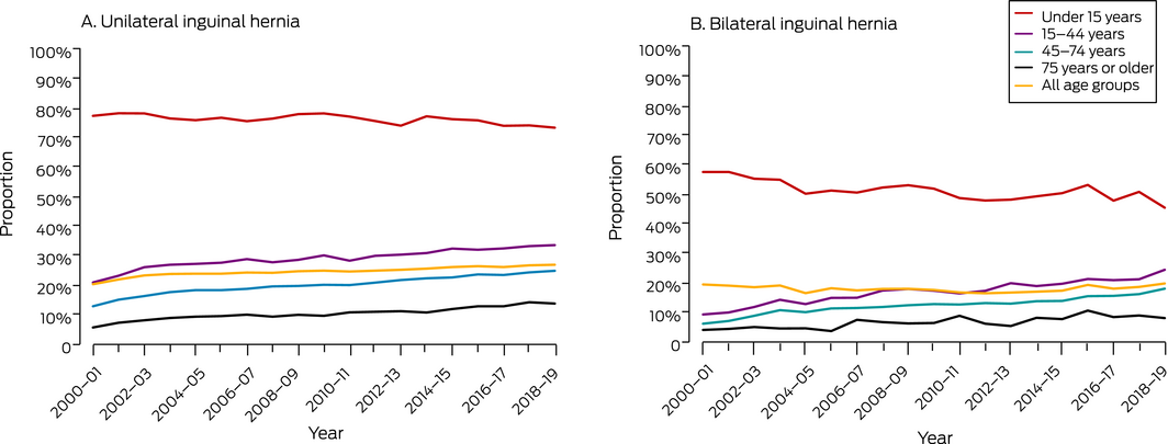 Box 1 – Same day inguinal hernia repair procedures as proportion of all procedures, Australia, 2000‒19, by laterality and age group