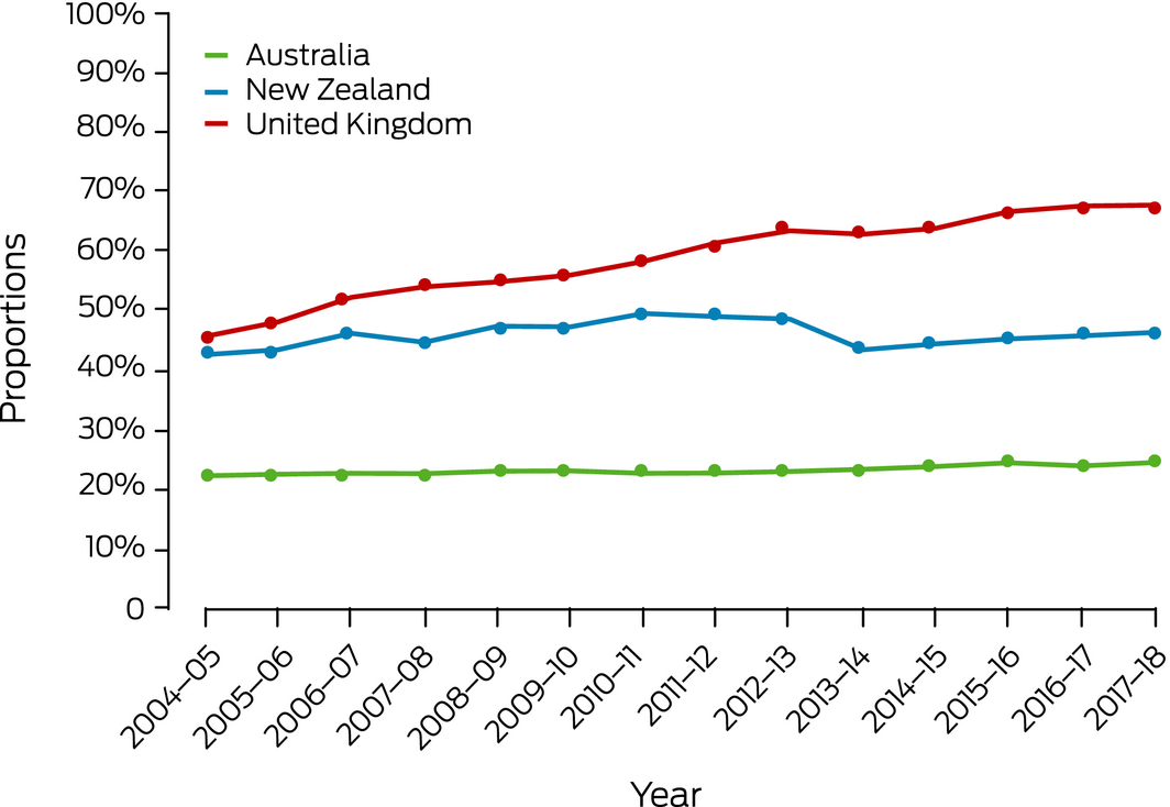 The same‐day inguinal hernia repair rate rose from 22.4% (95% CI, 22.0–22.8%) in 2004–05 to 24.6% (95% CI, 24.2–25.0%) in 2017–18. By way of comparison, it increased in New Zealand from 42.7% (95% CI, 41.6–43.9%) to 46.5% (95% CI, 45.4–47.6%), and in the United Kingdom from 45.8% (95% CI, 45.5–46.2%) to 67.8% (95% CI, 67.5–68.2%). The mean rate for this period was substantially lower in Australia (23.3%; 95% CI, 23.2–23.4%) than in New Zealand (46.1%; 95% CI, 45.7–46.4%) or the United Kingdom (58.8%; 95% CI, 58.8–60.0%) (Box 2). In New Zealand, the same‐day rate was lower in private (41.8%; 95% CI, 41.2–42.3%) than in public hospitals (47.8%; 95% CI, 47.5–48.2%).