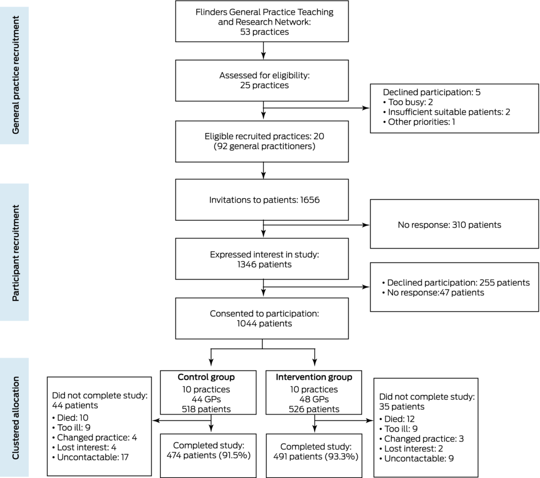 Twenty practices with a total of 92 GPs were recruited and their participation formalised by a memorandum of understanding during 23 January 2018 – 19 February 2018. The general practices invited 1656 patients to participate, of whom 1044 consented (63%) during 30 April 2018 – 10 October 2018. Intervention group practices implemented the intervention from 1 November 2018 to 31 October 2019. As the first recorded case of coronavirus disease 2019 (COVID‐19) in South Australia was reported on 1 February 2020, the pandemic did not affect the study. No practices withdrew during the intervention, and 12‐month follow‐up data were available for 965 patients (control group, 474 [92%]; intervention group, 491 [93%]) (Box 1).