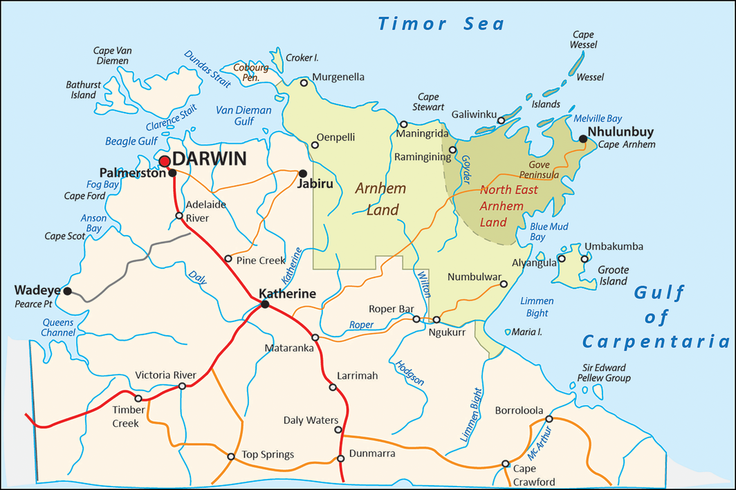 Box 1 – Map of the Top End of the Northern Territory, Australia, with the Arnhem Land region and Yolŋu Country, North East Arnhem Land shaded in green with approximate boundaries