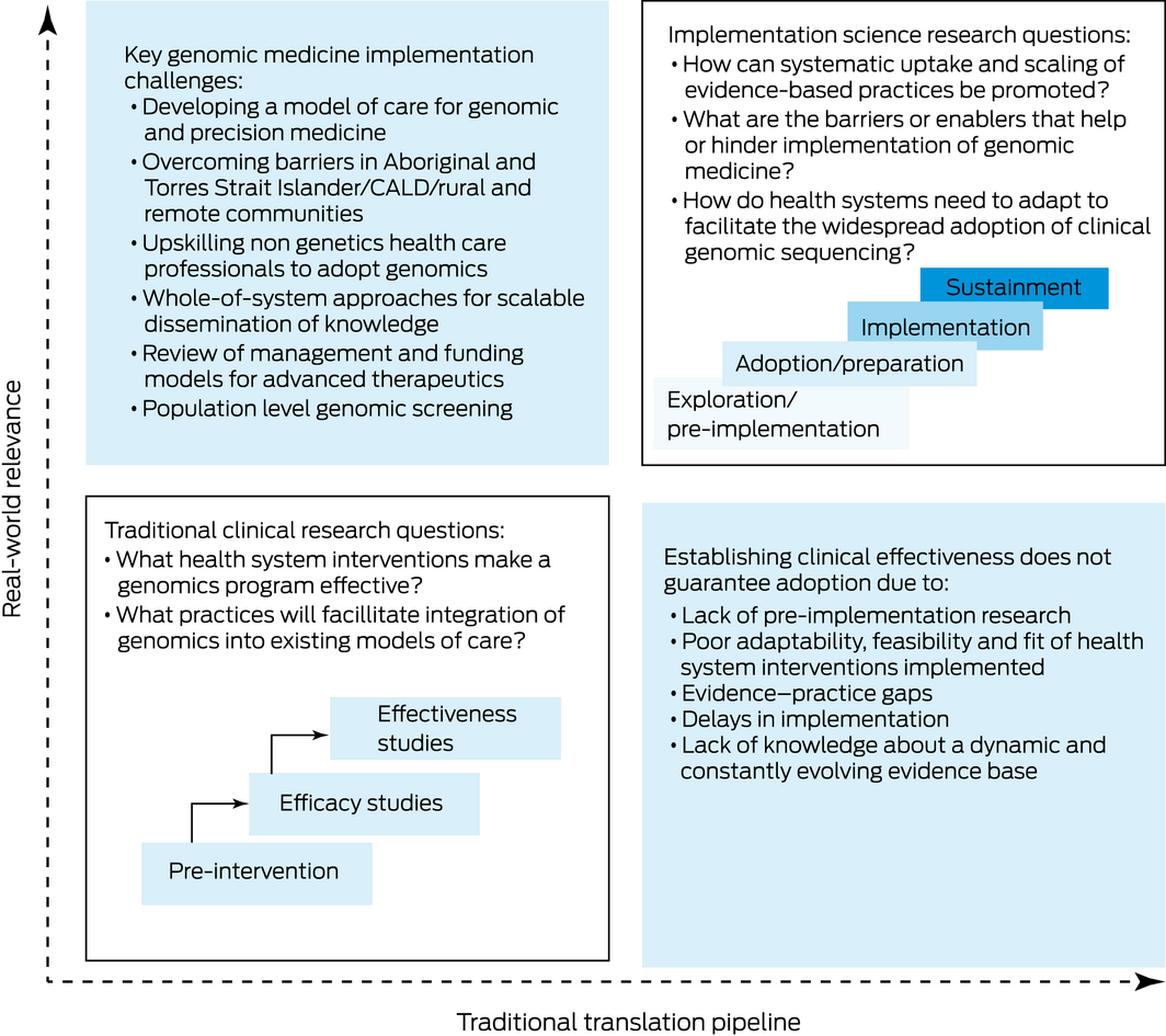 CALD = culturally and linguistically diverse. Figure adapted with permission from O'Connell et al.19 It highlights the key implementation challenges in genomic and precision medicine. It also illustrates the key differences between traditional clinical research, with its focus on intervention efficacy and effectiveness, and implementation science based research, which is focused on the “how” questions such as feasibility, sustainability and health system readiness for clinical adoption. These key differences help to address the problem that establishing clinical effectiveness alone does not guarantee clinical adoption due to many factors, such as evidence–practice gaps and localised barriers and needs.